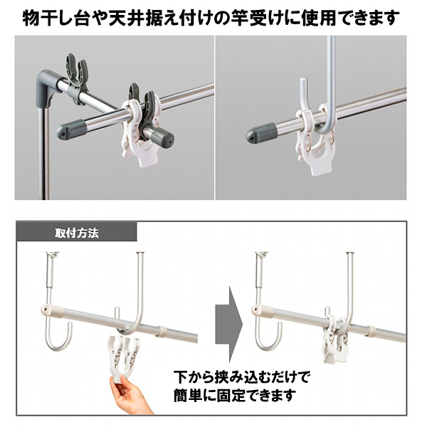 ツマミ付きなので、洗濯ばさみのように竿を挟み込んで簡単に取り付けできます。