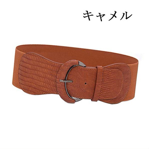 LAZA 【キャメル】【クロコ柄 幅広 ゴムベルト】幅広 ベルト ウエストマーク BELT 太ベルト 細見え フリーサイズ エレガント