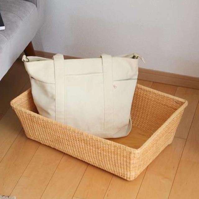 上品な籐を使用しており、隙間なく色も揃えて編まれているので、仕上がりがとても美しいです。また、持ち手部分には釘が打たれてあり、頑丈で見た目のアクセントにもなります。