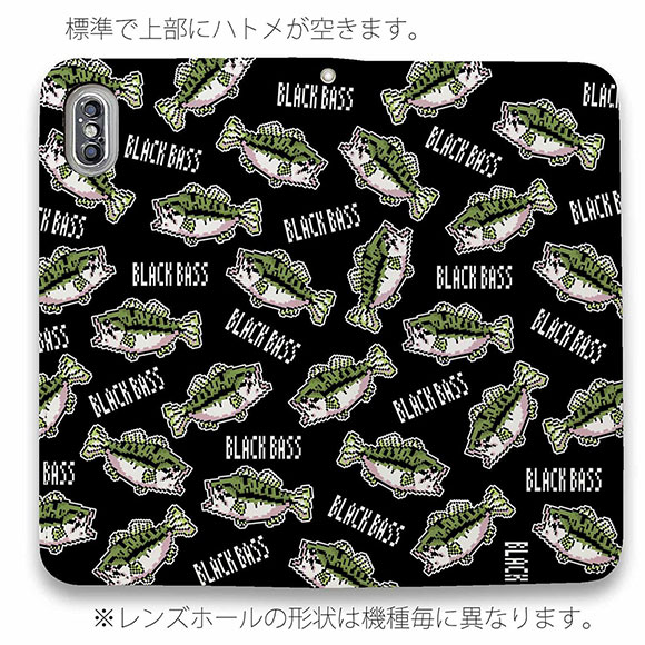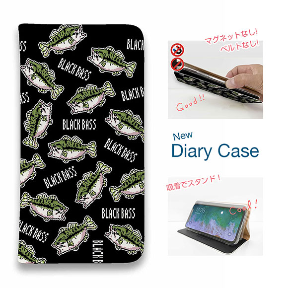 スマホケース 手帳型 ベルトなし iPhone17 Pro Max iPhone Air iPhone16e Pro Max 16 Plus 15 Pro Max 14 Plus Xperia 10 VII Galaxy AQUOS Pixel10 Pro XL 釣り 魚 ルアー 釣りざんまい ドット絵のブラックバスがいっぱい_カラフルブラック