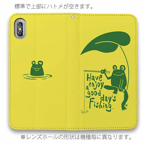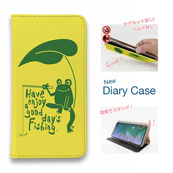 スマホケース 手帳型 ベルトなし iPhone17 Pro Max iPhone Air iPhone16e Pro Max 16 Plus 15 Pro Max 14 Plus Xperia 10 VII Galaxy AQUOS Pixel10 Pro XL 釣り 魚 ルアー 釣りざんまい カエルが釣りをするでケロ_カラフルイエロー