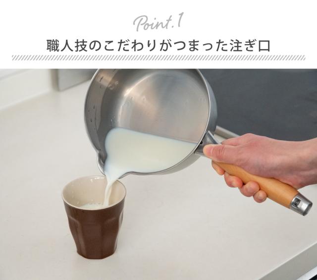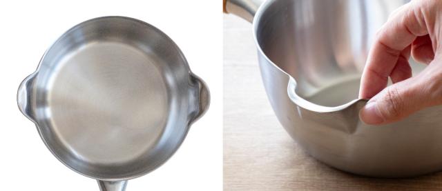 aikataミルクパンの最大の特徴は、他にはない形状の注ぎ口です。口の小さなスープジャーにも直接移すことができる、スムーズな注ぎ心地と、汁切れの良さが魅力です。