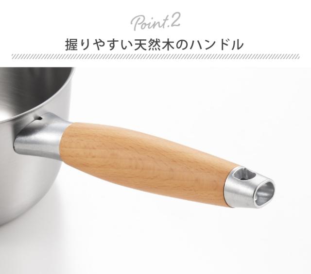 | 材質 | 本体:18-0ステンレス(1.0mm) ハンドル:天然木(ブナ材)、アルミ合金、18-8ステンレス |