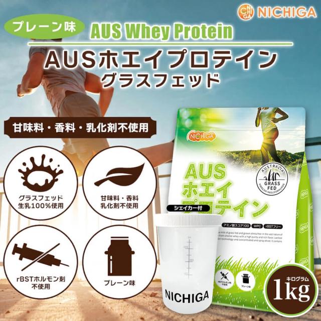 <シェイカー セット> AUSホエイプロテイン グラスフェッド 1kg プレーン WPC製法タンパク含有率81% USDA認証 取得原料 WPC 牛成長ホルモン不使用 甘味料・香料・着色料・保存料無添加 乳化剤不使用 NICHIGA(ニチガ) TK1
