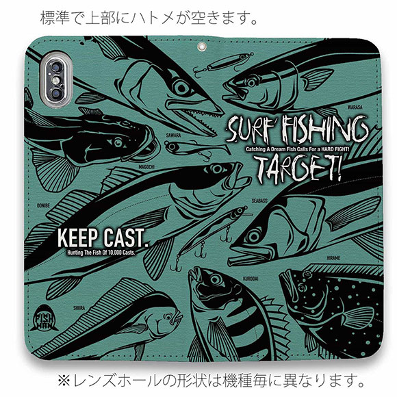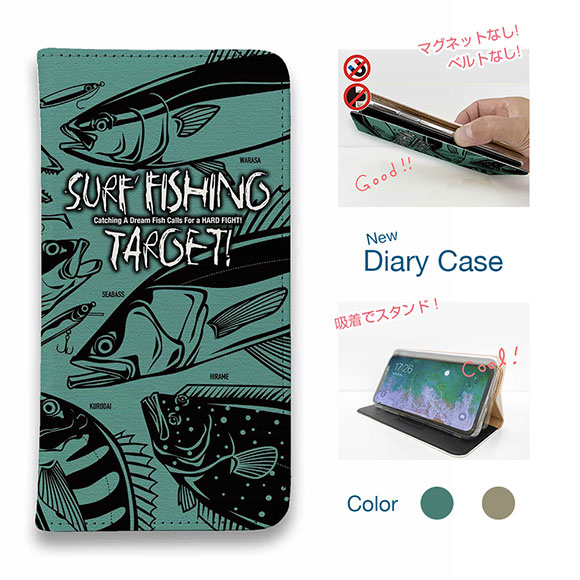 スマホケース 手帳型 ベルトなし iPhone17 Pro Max iPhone Air iPhone16e Pro Max 16 Plus 15 Pro Max 14 Plus Xperia 10 VII Galaxy AQUOS Pixel10 Pro XL 釣り 魚 ルアー FISH MAN SURF FISHING TARGET! グリーン