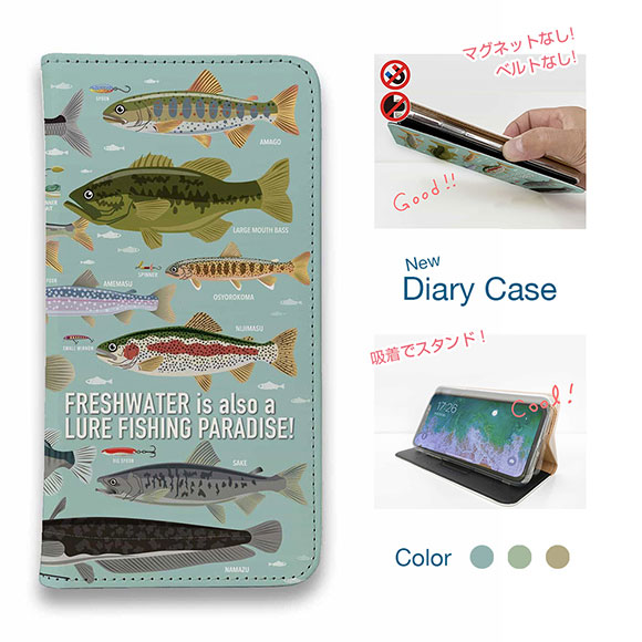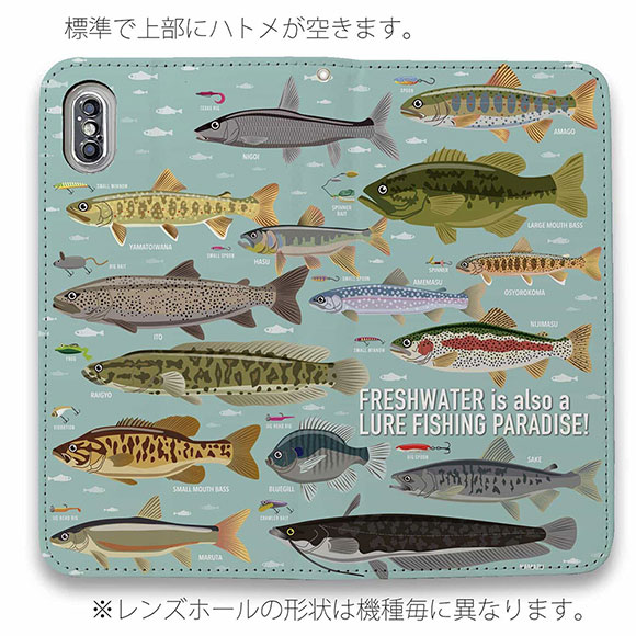 スマホケース 手帳型 ベルトなし iPhone17 Pro Max iPhone Air iPhone16e Pro Max 16 Plus 15 Pro Max 14 Plus Xperia 10 VII Galaxy AQUOS Pixel10 Pro XL 釣り 魚 ルアー FISH MAN フィッシングパラダイス「フレッシュウォーター編」 ブルー