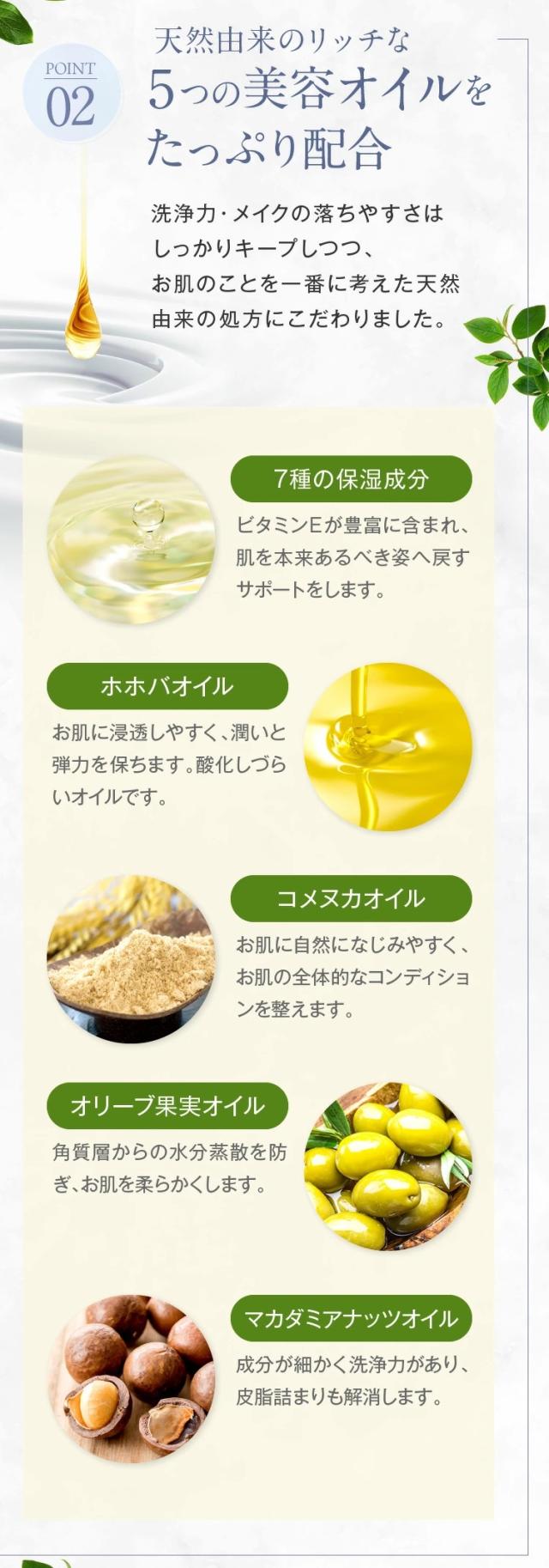 ◆アルガンオイル、ホホバオイル、マカダミアナッツオイル、コメヌカオイル、オリーブ果実オイルという天然由来のリッチな5つの美容オイルをたっぷり配合。天然由来成分99%以上にこだわりながらするっとしたメイク落ちを目指しました。