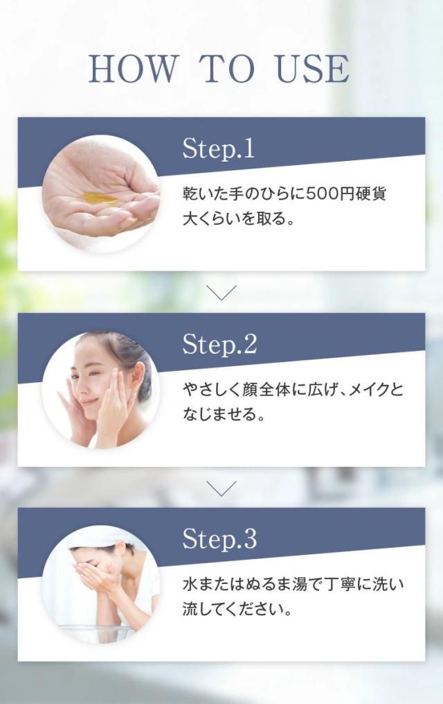 ◆適量(2〜3プッシュ程度)を手にとり、やさしくマッサージするように顔全体になじませながらメイクや汚れを浮かせてください。その後、水またはぬるま湯で洗い流してください。