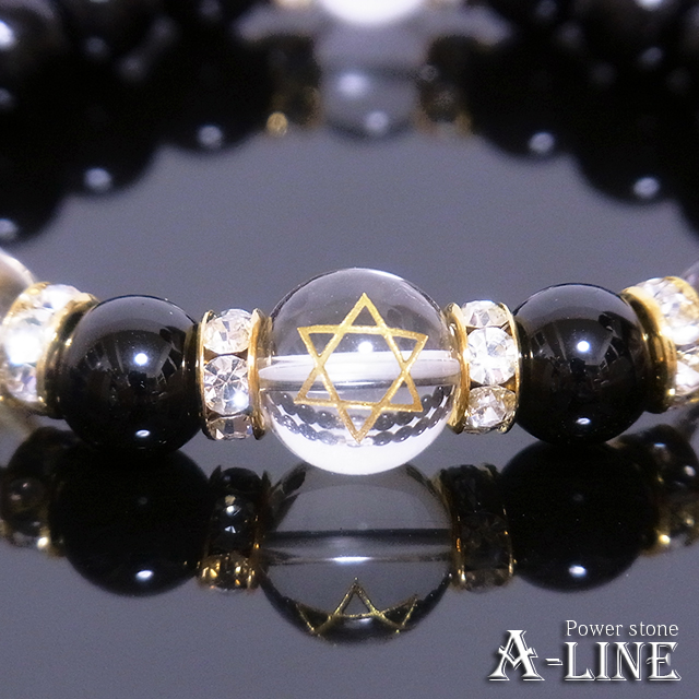 太古から宇宙のエネルギーを集約すると言われる【六芒星】を金彫りした水晶12mmを使った六芒星ブレス!オニキスを使用したシンプルなデザイン♪