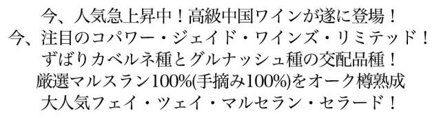 今、人気急上昇中!高級中国ワインが遂に登場!今、注目のコパワー・ジェイド・ワインズ・リミテッド!ずばりカベルネ種とグルナッシュ種の交配品種!厳選マルスラン100%(手摘み100%)をオーク樽熟成大人気フェイ・ツェイ・マルセラン・セラード!■さまざまなギフトアイテムをご用意しております。お中元 ギフト 御中元 お盆 お礼 敬老の日 クリスマス 冬ギフト お歳暮 御歳暮 お年賀 御年賀 お正月 年末年始 ご挨拶 バレンタイン ホワイトデー お返し 父の日 母の日 ギフト 贈答品 お土産 手土産 御祝 御礼 内祝い 引き出物 お祝い 結婚祝い 結婚内祝い 出産祝い 出産内祝い 引き菓子 快気祝い 快気内祝い 進学祝い 誕生日祝い バースデーケーキ プレゼント Wedding ウェディング ホームパーティ お花見 パーティ 退職ギフト 退職 就任祝い