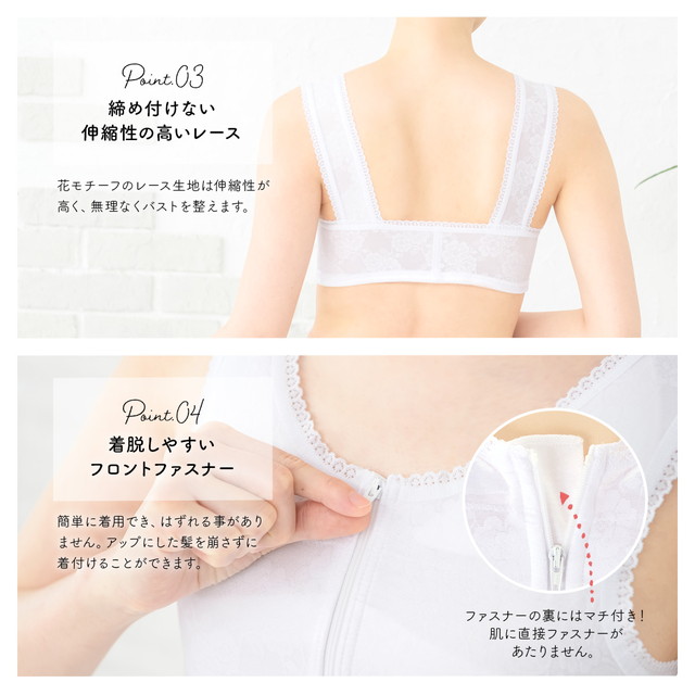 花をデザインしたレース生地は、伸縮性が高く無理なくバストを整えます。