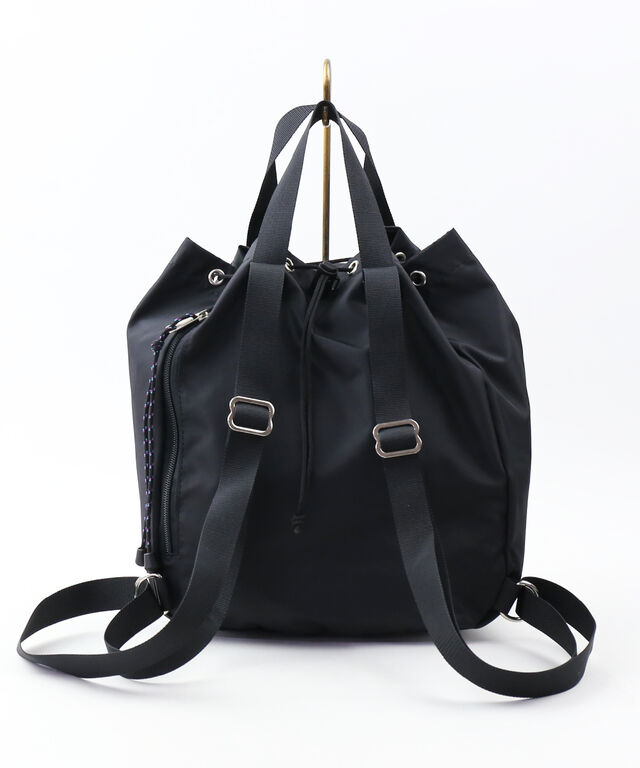 【特徴】間口:巾着タイプ、背面:ファスナー開閉、内側:ポケット大×1、ポケット中×1