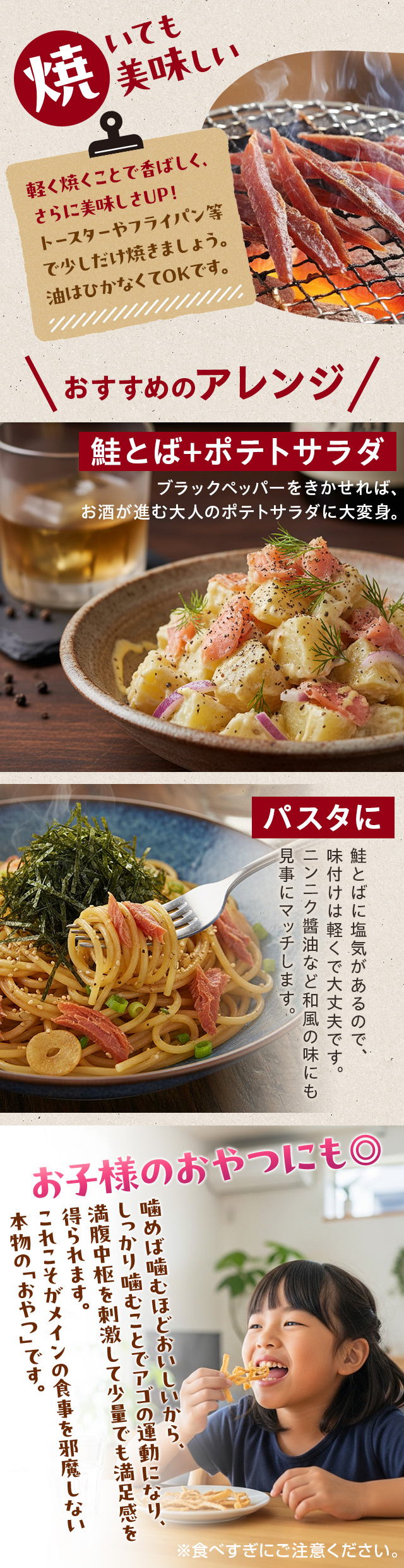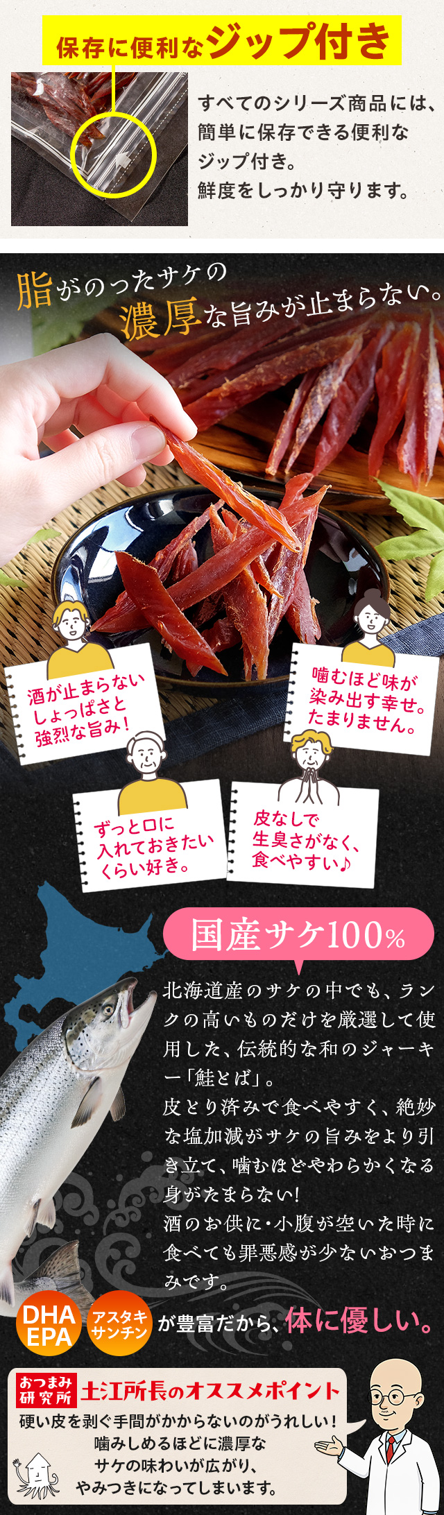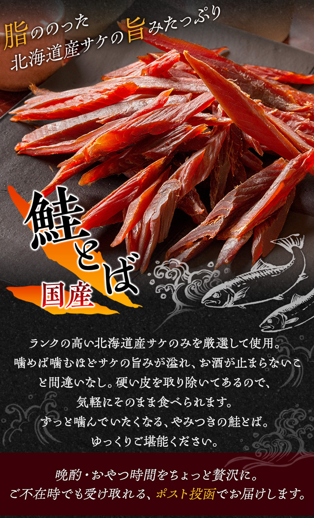 ランクの高い北海道産の鮭のみを厳選して使用。噛めば噛むほど鮭の旨みがあふれ出し、お酒が止まらなくなります。固い皮の部分は除いてあり、そのまま食べられる手軽さ。珍味の中でもワンランク上の鮭とばを、たっぷりサイズでお届けします。
