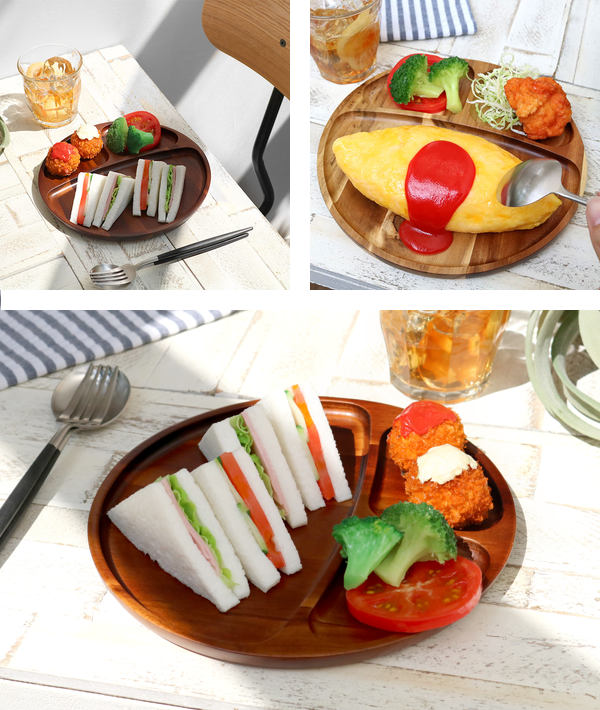 天然木の自然な木目が美しいランチプレートです。仕切り付きで味が混ざることがなく、ワンプレートに盛り付けると洗い物も少なく実用的です。シーンを選ばず料理に馴染み、カフェのような雰囲気を楽しめます。