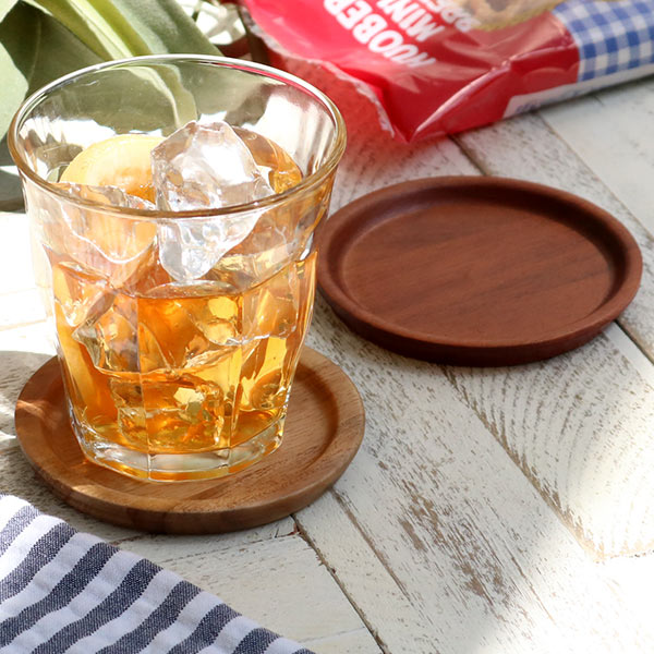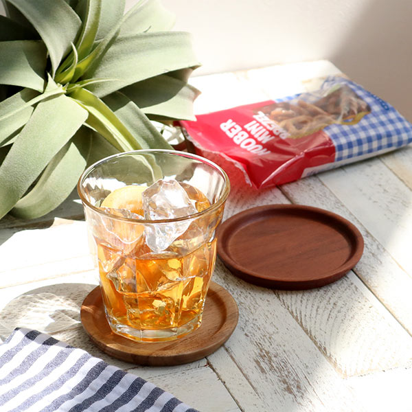 天然木の自然な木目が美しいコースターです。グラスの上にのせてフタとしてもお使い頂けます。シーンを選ばず空間に馴染み、カフェのような雰囲気を楽しめます。