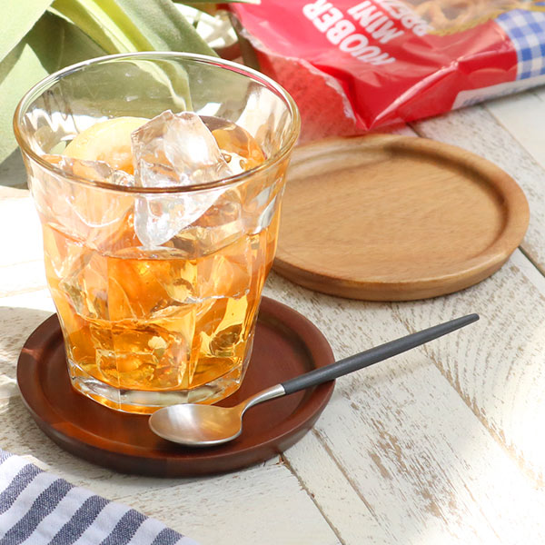 天然木の自然な木目が美しいコースターです。グラスの上にのせてフタとしてもお使い頂けます。シーンを選ばず空間に馴染み、カフェのような雰囲気を楽しめます。