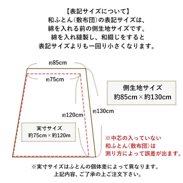 | 85×130cm(綿を入れる前のサイズ) ※製品サイズは一回り小さくなります。 適合カバーサイズ…85×130cm |