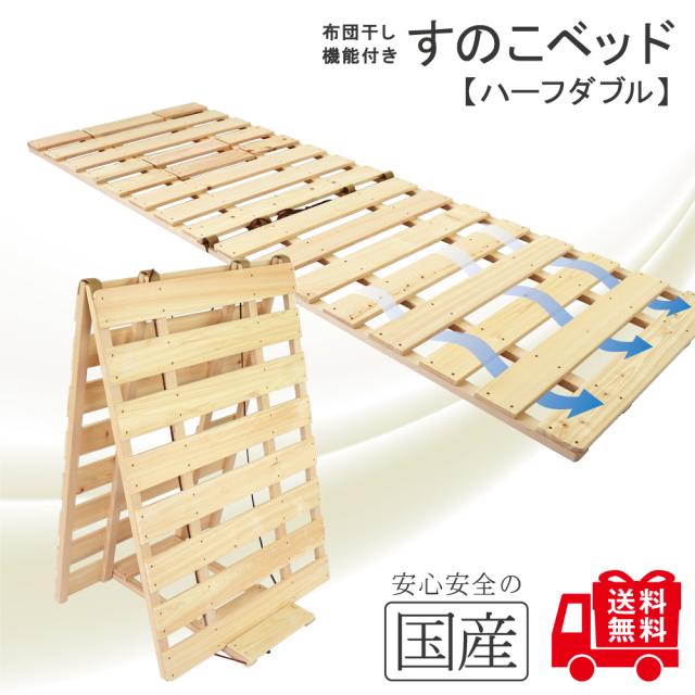 【送料無料】布団干し機能付きすのこベッド(ハーフダブルサイズ)【国産ひのき or 高級桐】【組立不要】黄砂 雨 湿気 カビ ダニ対策 めいじ屋 折りたたみ 室内干し 部屋干し 桧 ヒノキ 檜 脱プラ すぐに使える 冬もさわやかに 新枕干し機能付き