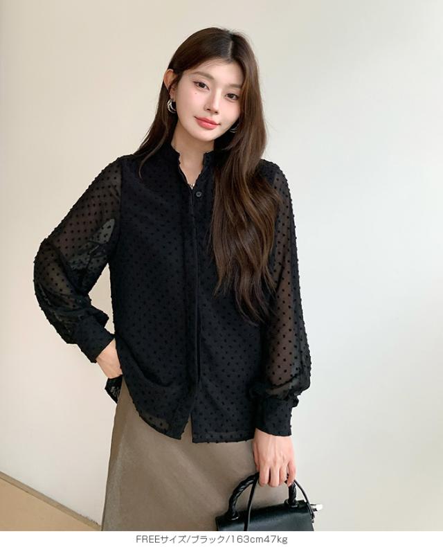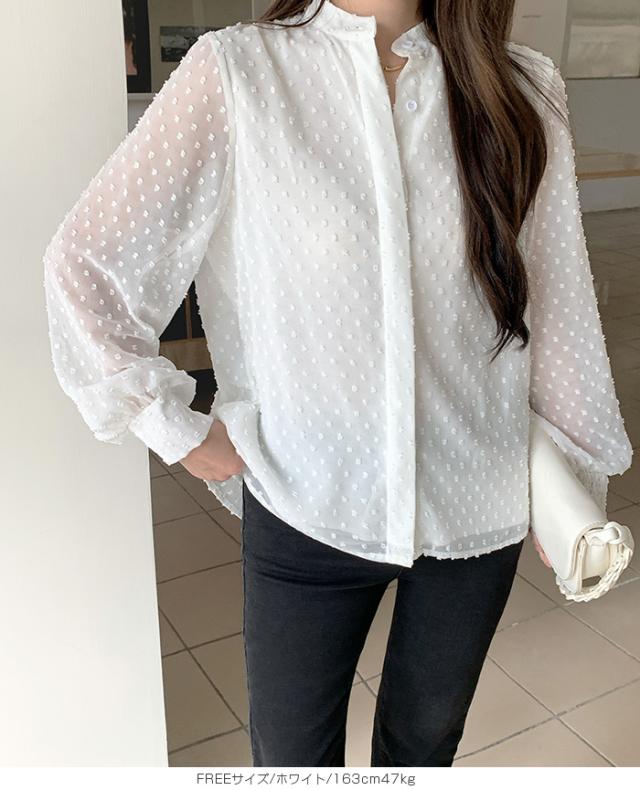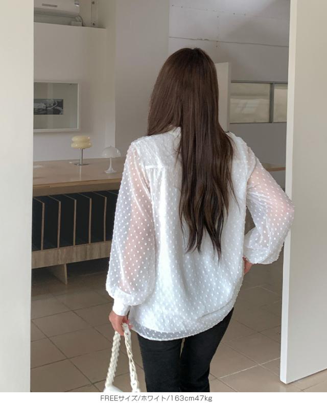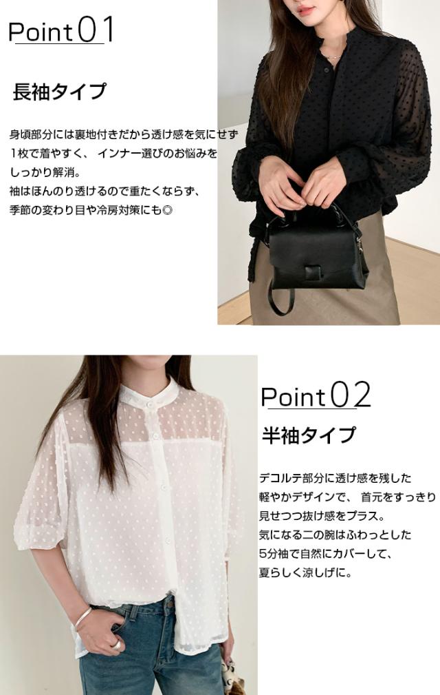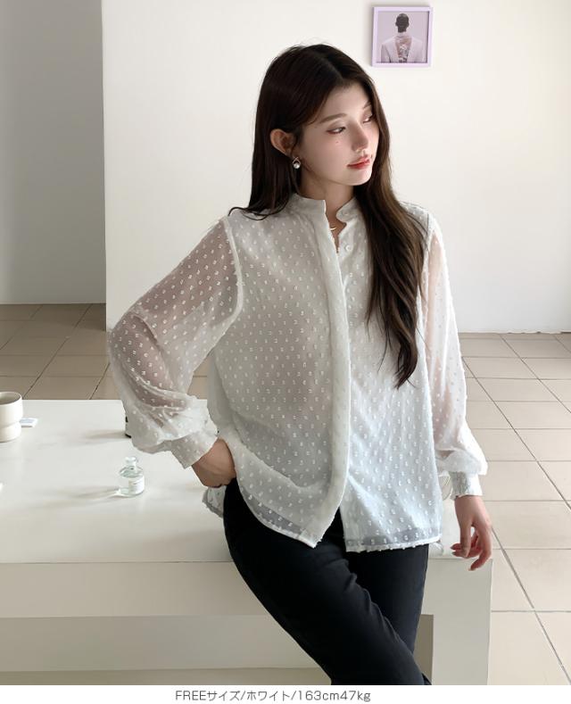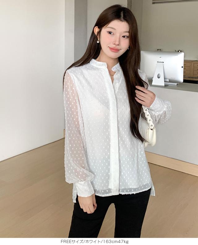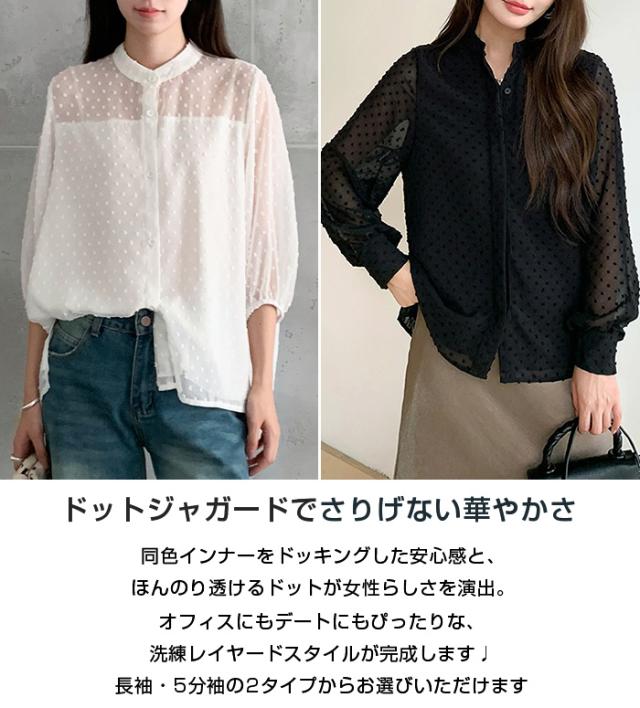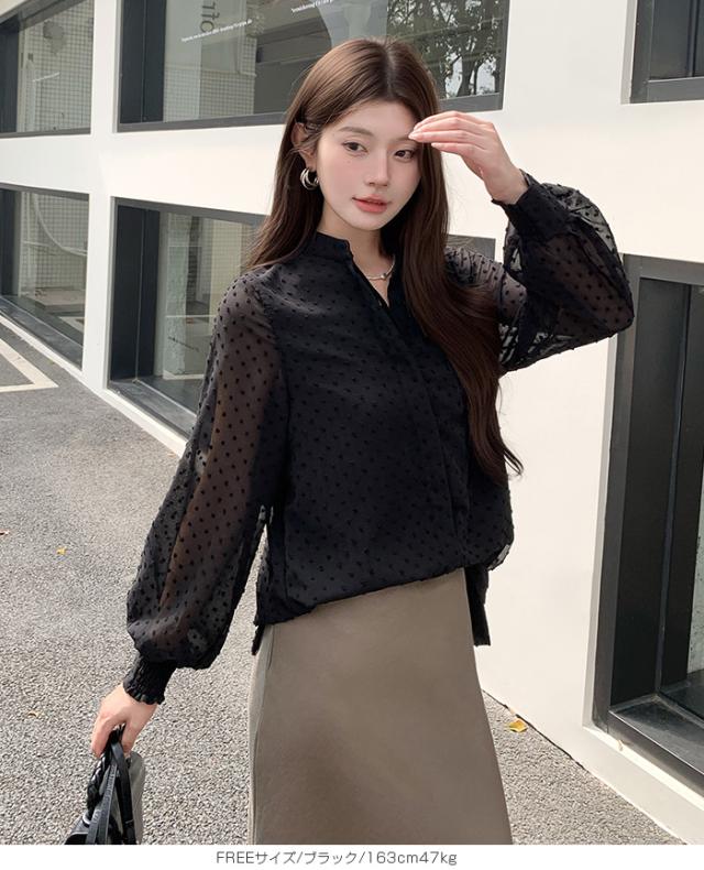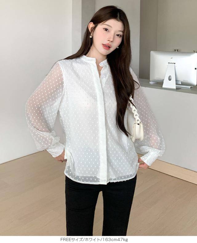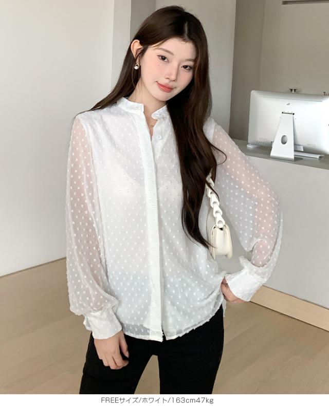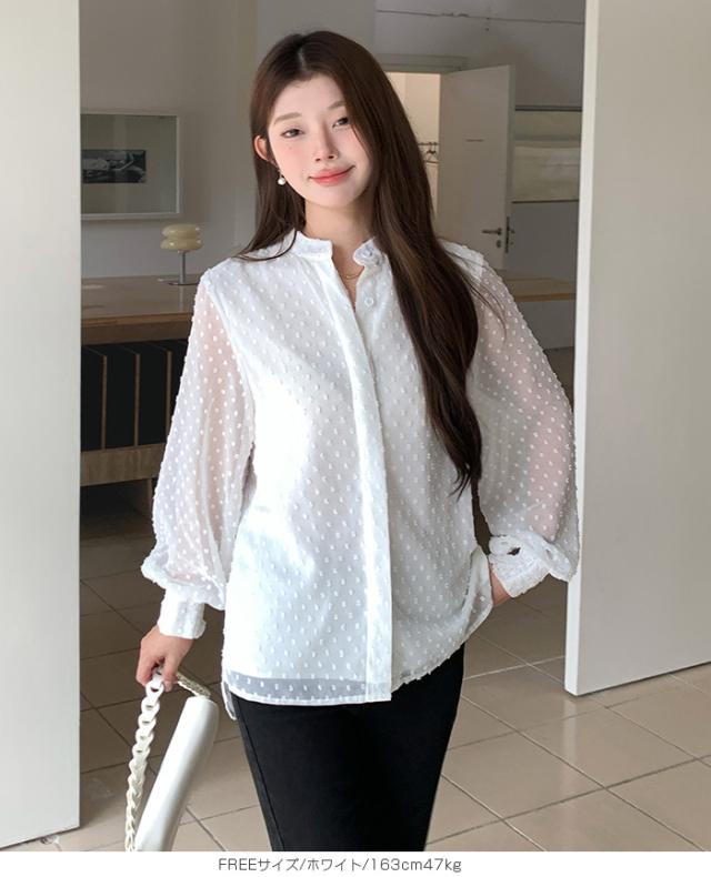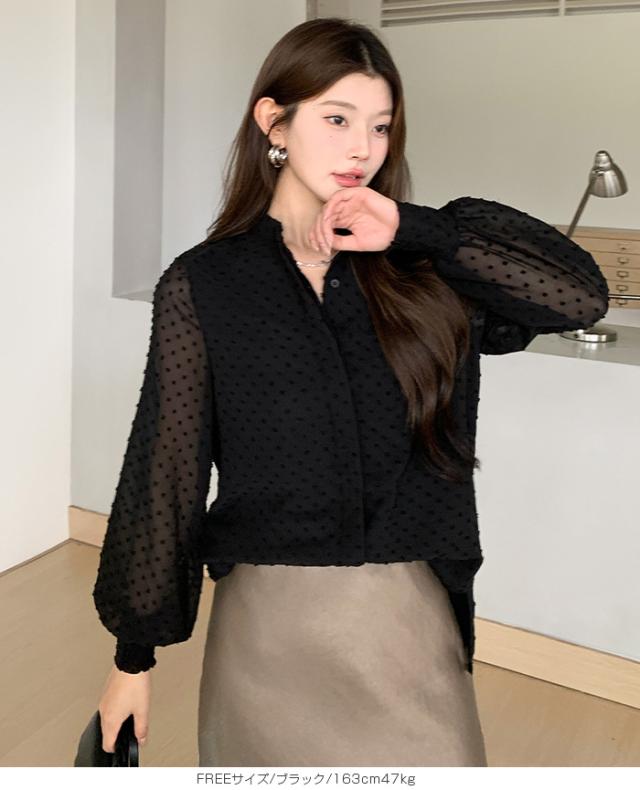 55%OFFクーポン!ブラウス レディース シアー 長袖 バンドカラーブラウス ドットジャガード 透け感 ぽわん袖 春夏 トップス 体型カバー 上品 きれいめ 白 黒 オフィス 【ドットシアーブラウス】 ダークエンジェル 秋新作 ●即納●