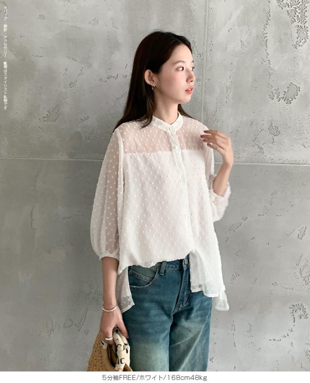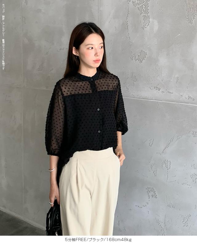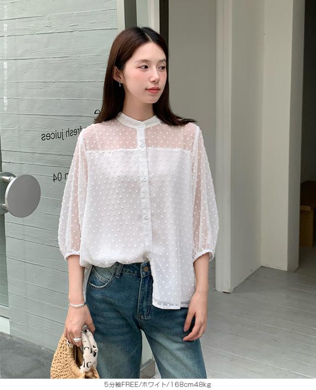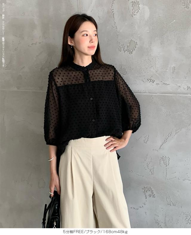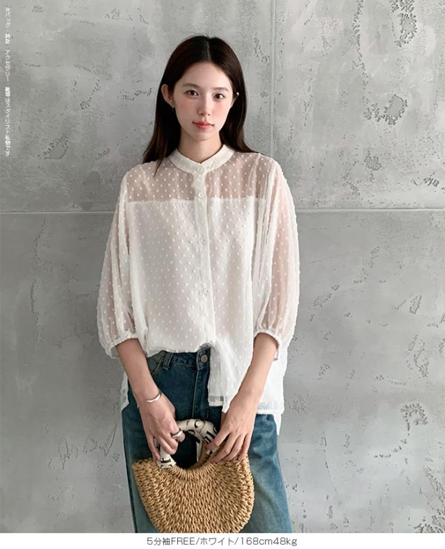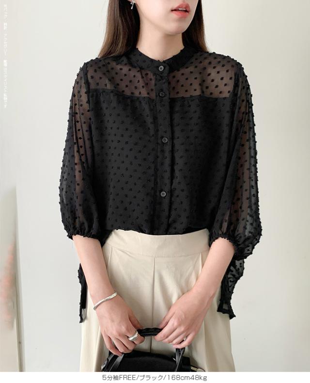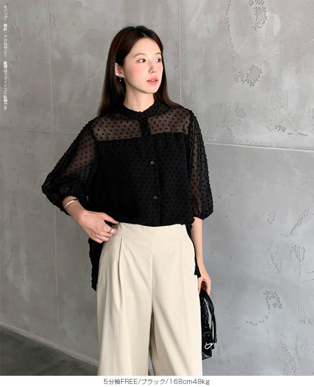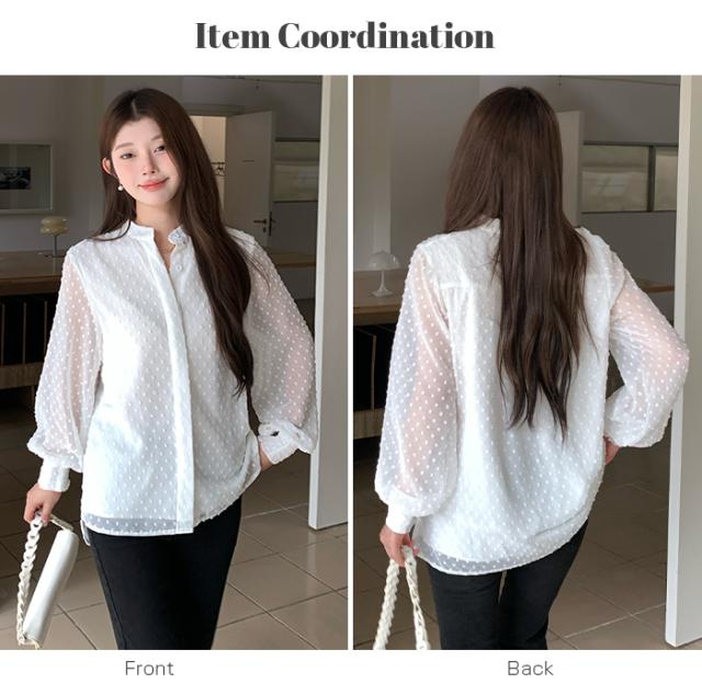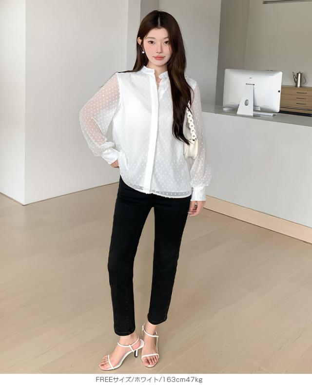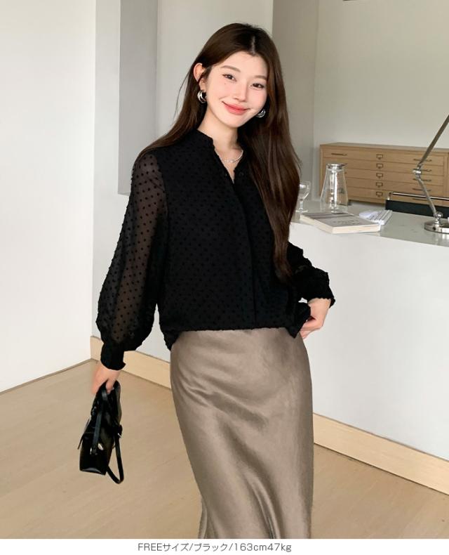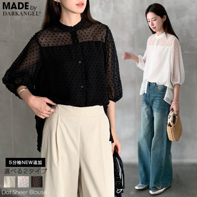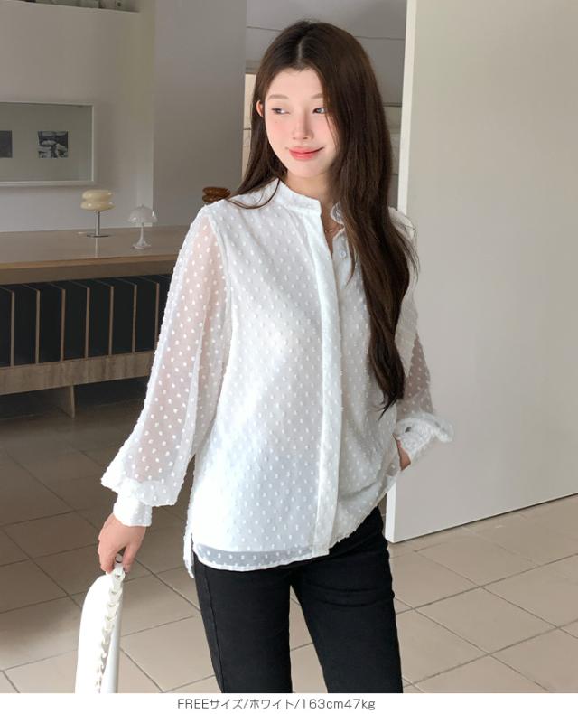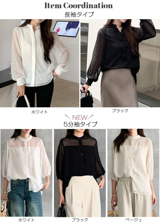 55%OFFクーポン!ブラウス レディース シアー 長袖 バンドカラーブラウス ドットジャガード 透け感 ぽわん袖 春夏 トップス 体型カバー 上品 きれいめ 白 黒 オフィス 【ドットシアーブラウス】 ダークエンジェル 秋新作 ●即納●