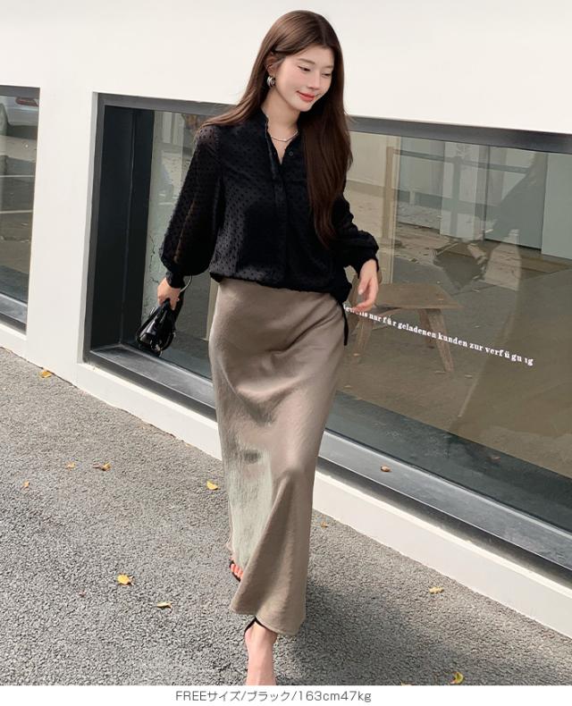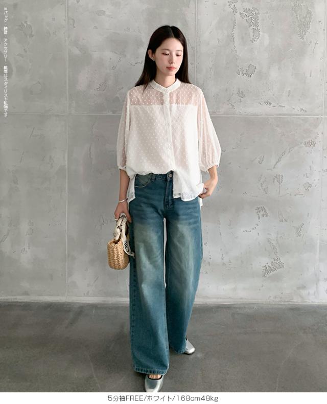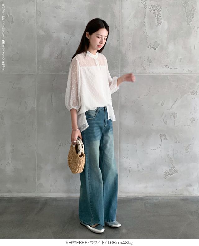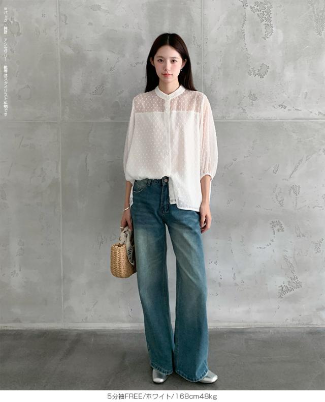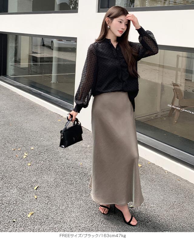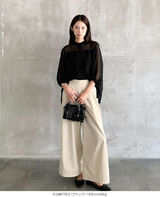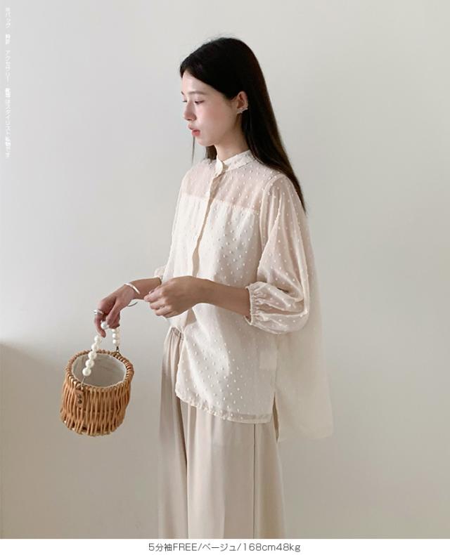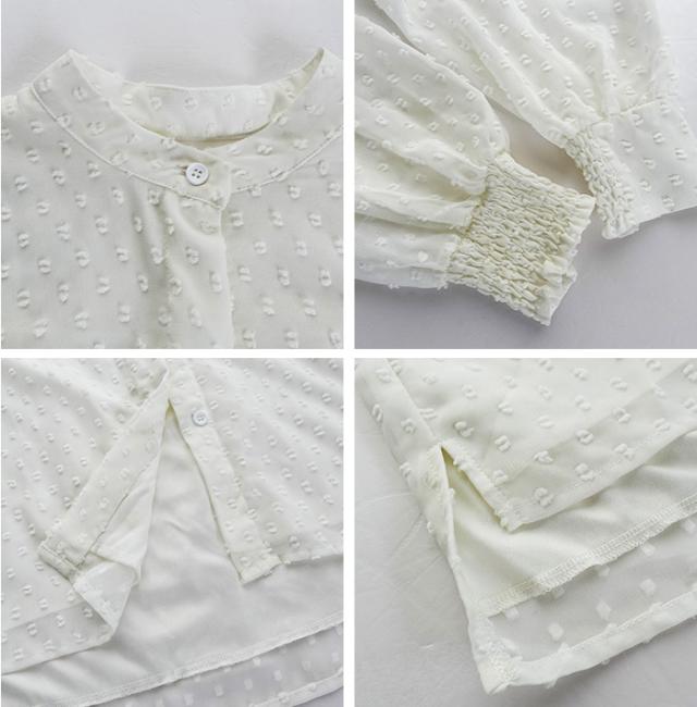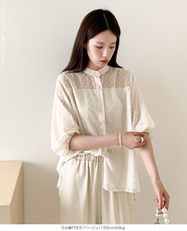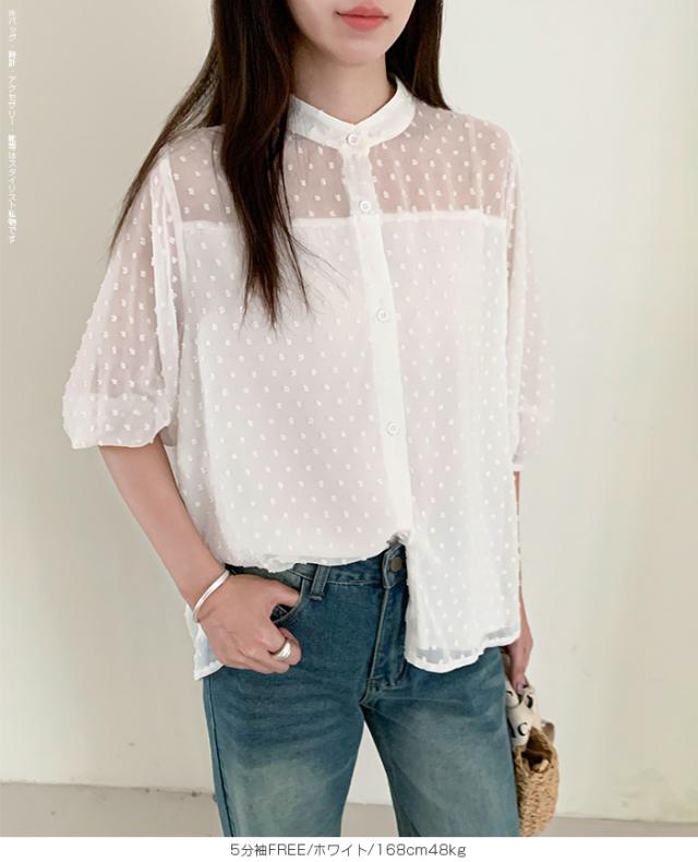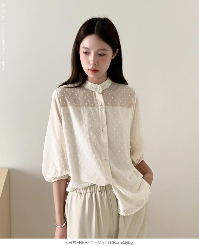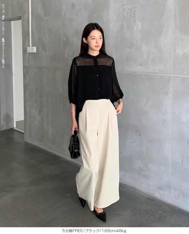 55%OFFクーポン!ブラウス レディース シアー 長袖 バンドカラーブラウス ドットジャガード 透け感 ぽわん袖 春夏 トップス 体型カバー 上品 きれいめ 白 黒 オフィス 【ドットシアーブラウス】 ダークエンジェル 秋新作 ●即納●
