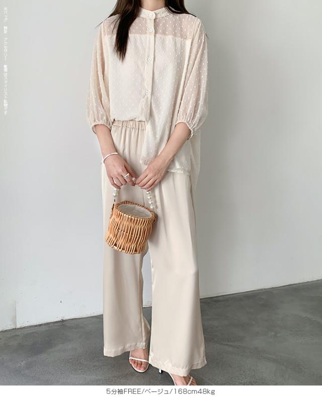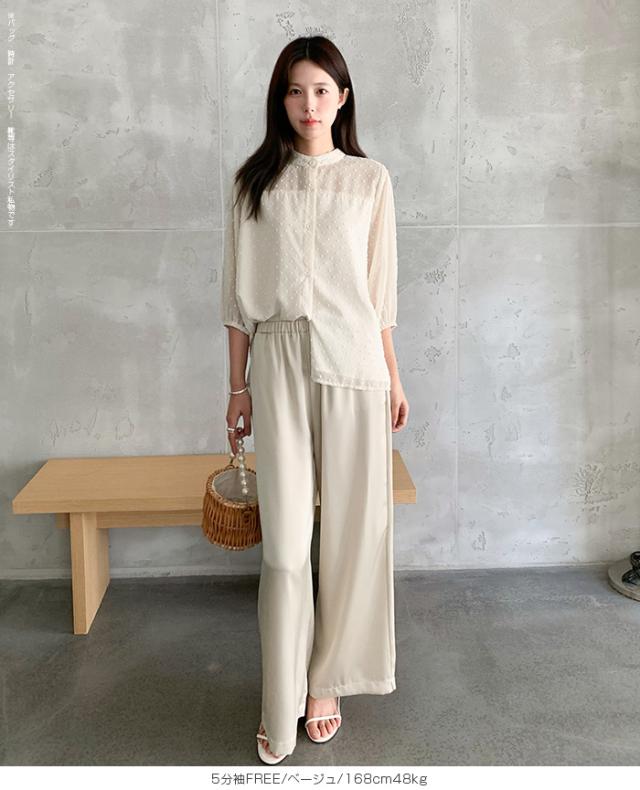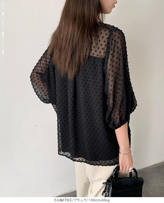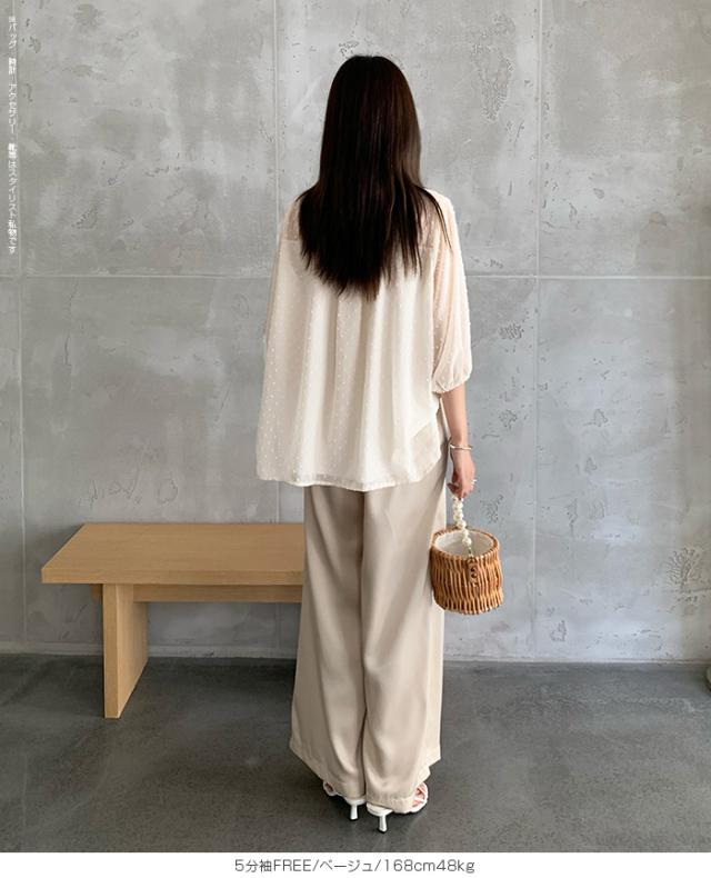 透け感のあるドットジャガードが女性らしさを引き立てる、 選べる2タイプのぽわん袖ブラウス。 ふんわり袖とゆったりしたシルエットで、 気になる体型もしっかりカバー。 さらっと軽やかな素材感で夏も爽やかに着られ、 羽織りとしても便利です。 《商品ポイント》 選べる2タイプ:定番の長袖と、夏に嬉しいNEW 5分袖タイプが登場。 ドットジャガード素材:透け感があり、さりげなく上品な表情に。 ぽわん袖デザイン:ふんわり袖が二の腕を自然にカバー。 《デザイン・シルエット》 バンドカラーで首元はすっきり上品。 袖口のギャザーでぽわんとした女性らしいシルエットに。 体を拾わないゆったりめのサイズ感で体型カバーも◎ 透け感を活かしたインナー合わせや羽織りにも使える万能デザイン。 《コーディネート提案》 デニムパンツと合わせてカジュアルフェミニンに。 タイトスカートやワイドパンツと合わせて大人きれいめコーデ。 透け感を活かしてキャミやタンクとレイヤードスタイルもおすすめ。 羽織り感覚で冷房対策にも◎。 《サイズ・カラーバリエーション》 カラー:ブラック/ホワイト/ベージュ サイズ:5分袖/FREE 長袖/FREE 《素材・機能性》 ・素材:本体:ポリエステル95%、ポリウレタン5% 裏地:ポリエステル100% ・透け感:ホワイトあり(インナーと組み合わせて楽しめます) ・伸縮性:なし ・厚み:普通(春〜秋に◎) |