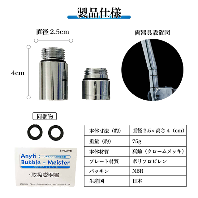 ■バブルマイスターシャワー用は、G1/2のネジ山のシャワーヘッドに適合します。■シャワーヘッドのネジ穴が変形していたり、障害物があると取付できない事があります。特殊な形状をしたシャワーヘッドには適合しない場合がございますので事前にご確認ください。■ファインバブルの発生には、0.1Mpa以上の水圧を推奨いたします。■KVK製シャワーヘッドをご使用の場合は、別途同梱の変換アダプタをご使用ください。■ガスター製のシャワーヘッドをご使用の場合、水圧が低い場合が多い為、推奨いたしておりません。