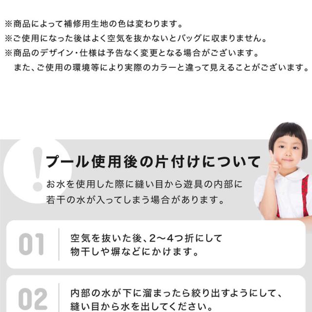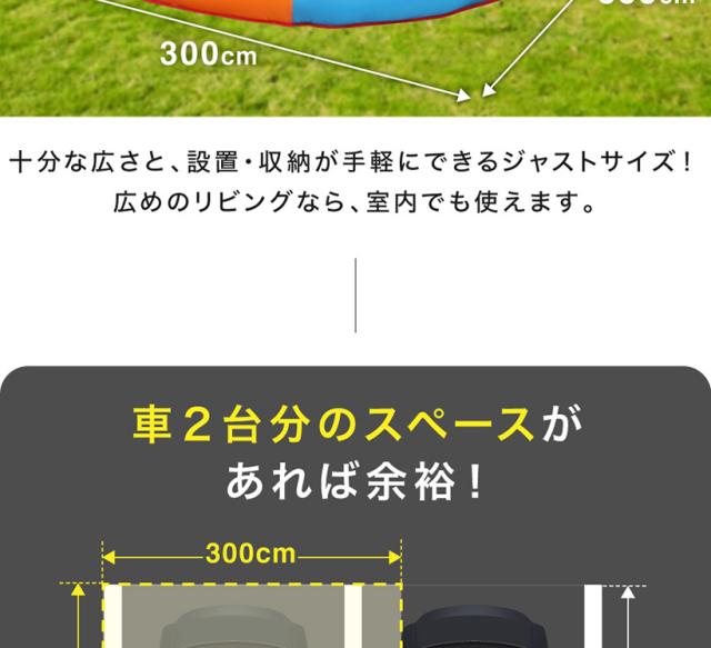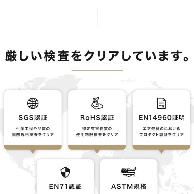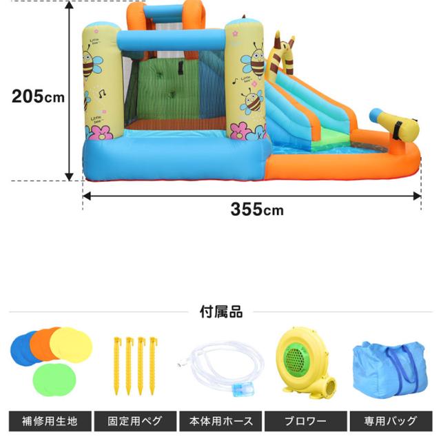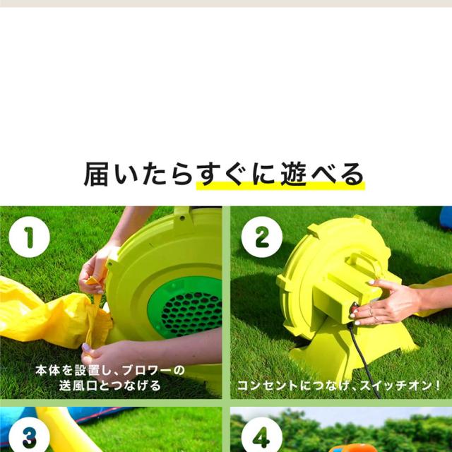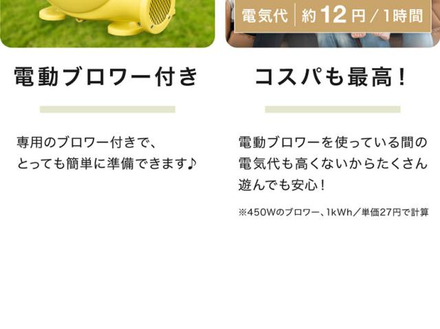 | 付属品 | 専用ブロワー(450w)、固定用ペグ、本体用ホース、修復用生地、バッグ、取り扱い説明書 |