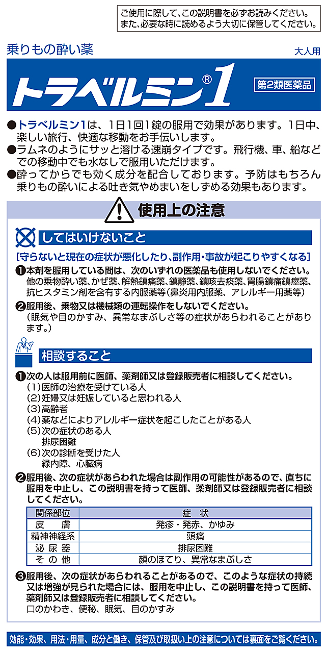 ・トラベルミン1は、1日1回1錠の服用で効果があります。1日中、楽しい旅行、快適な移動をお手伝いします。・ラムネのようにサッと溶ける速崩タイプです。飛行機、車、船などでの移動中でも水なしで服用いただけます。