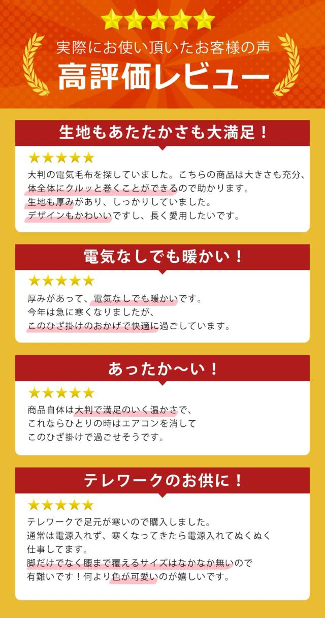 - 去年使っていた電気ブランケットより大きいサイズのブランケットが今年は欲しくて買いました。 発送も凄く早く助かりました! 電気ブランケットがあるのと無いのとでは温もりが全然違うので冬は必需品です。またタイマー付きが嬉しいです。