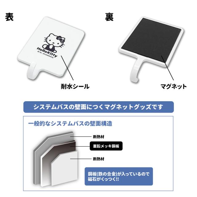 シンプルなハローキティのワンポイントがカワイイ!お風呂の壁面や冷蔵庫など、磁石のつく面に使えるマグネットフックです。ボディスポンジや柄付ブラシなどを掛けるのに便利です。