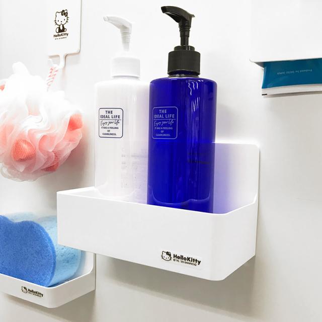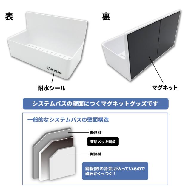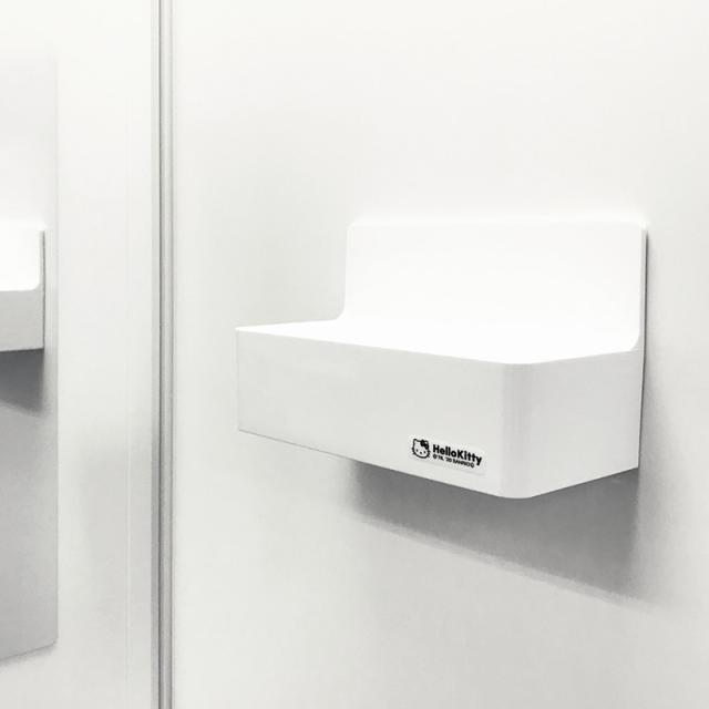 シンプルなハローキティのワンポイントがカワイイ!お風呂の壁面や冷蔵庫など、磁石のつく面に使えるマグネットバスポケットです。シャンプーなどのボトル置きに便利です。