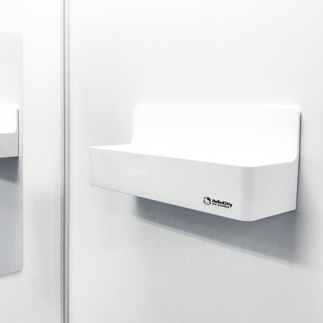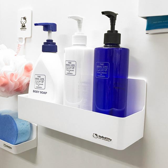 シンプルなハローキティのワンポイントがカワイイ!お風呂の壁面や冷蔵庫など、磁石のつく面に使えるマグネットバスポケットです。シャンプーなどのボトルが3本入るワイドタイプ。