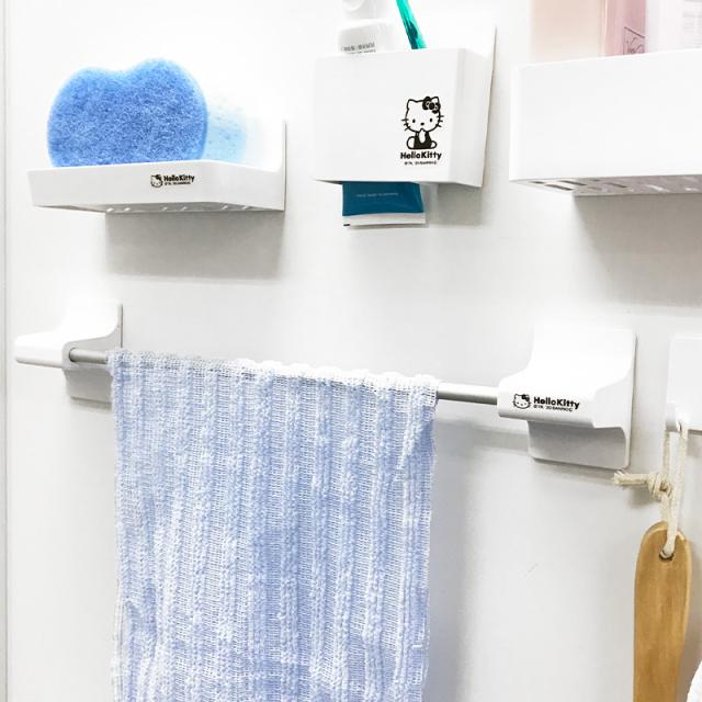 シンプルなハローキティのワンポイントがカワイイ!お風呂の壁面や冷蔵庫など、磁石のつく面に使えるマグネット浴用タオルハンガーです。フェイスタオルも使える35cm幅。