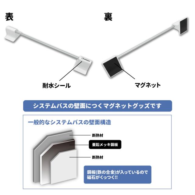 浴室の壁を傷付けにくく、サビないラバーマグネットを使用!マグネットタイプですので、付け外しが何度でもでき、位置調整が簡単にできます。