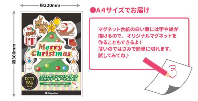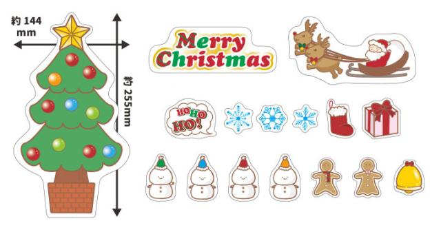 ![]() ミニツリー×1、クリスマスロゴ×1、サンタ×1、フキダシ×1、プレゼント×1、オーナメントパーツ×11、マグネット台紙×1が入っています! |