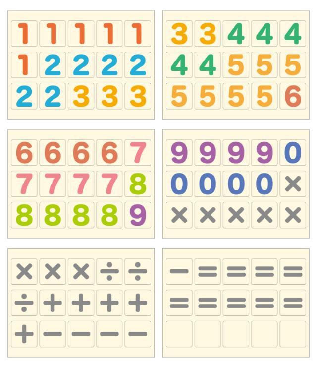 1・2×各6枚、5×各7枚、3・4・6・7・8・9・0×各5枚、記号(×・=)×各9枚、記号(+・−)×各5枚、記号(÷)×各3枚、無地×5枚 ![]() |