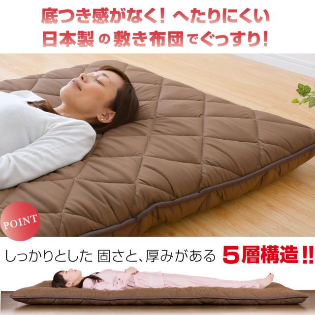 | 商品詳細 | 5層構造で極厚に仕上げた敷布団です。 従来の敷布団で起こりやすい底つき感を軽減し、へたりにくく、シングルサイズよりも少し長めのシングルロングサイズで余裕のある大きさです。 ブラウンとホワイトの2色からお選びください。 中綿の片寄りや、型崩れを起こしにくいよう仕上げてありますので、長期にわたってふかふかの感触をお楽しみいただけます。 中綿には、抗菌、防臭、防ダニ効果がある東洋紡フィルハーモニィわたを使用しています。 |
