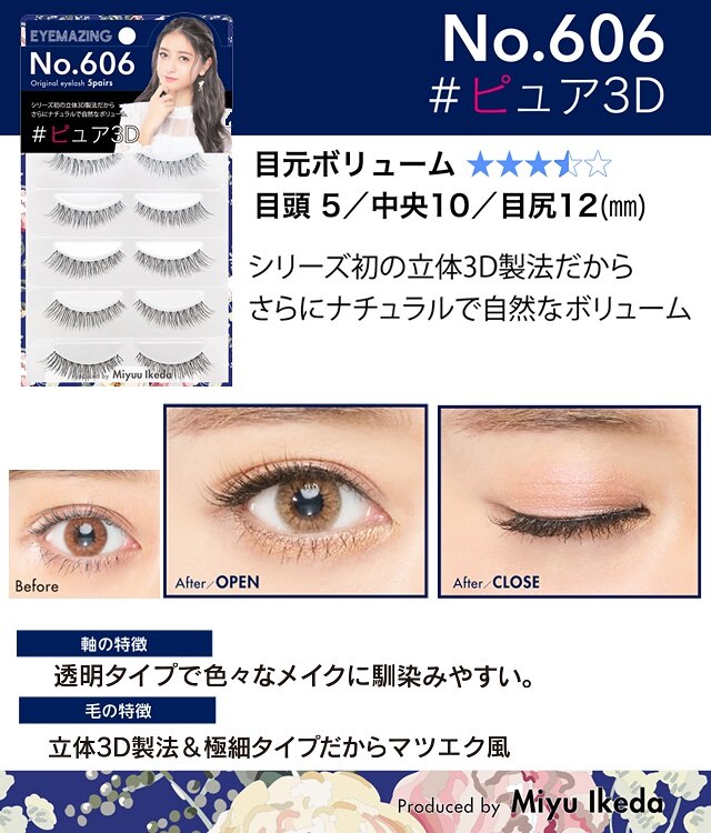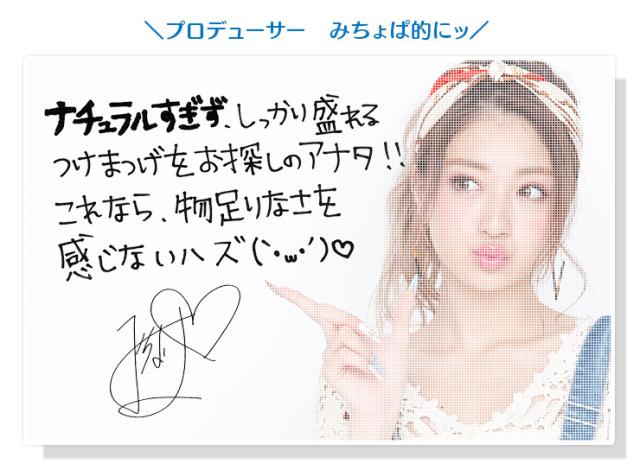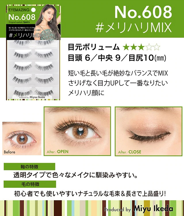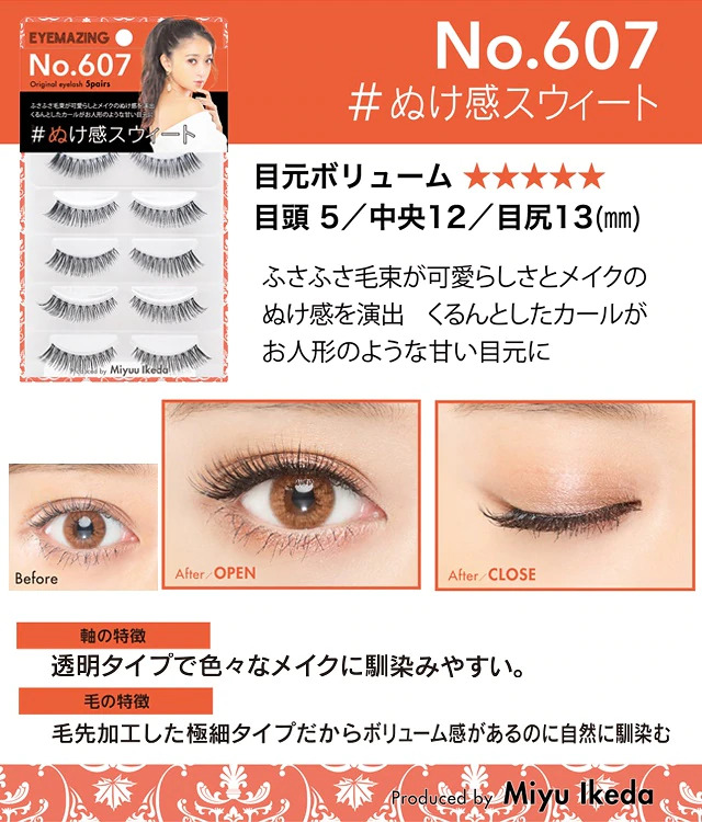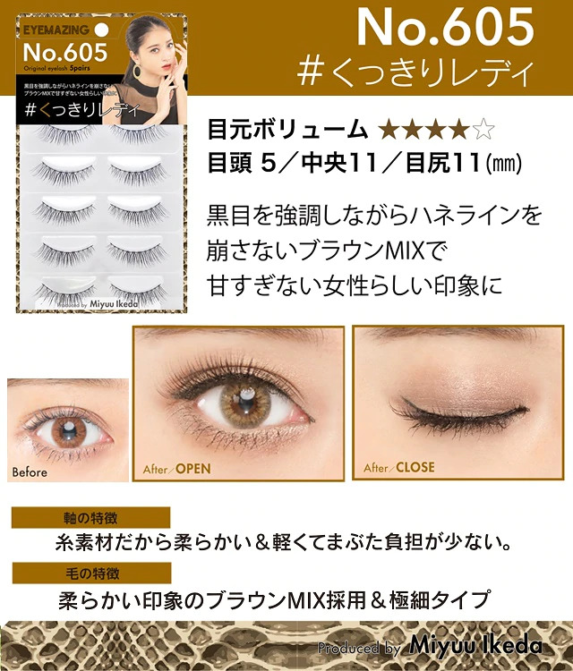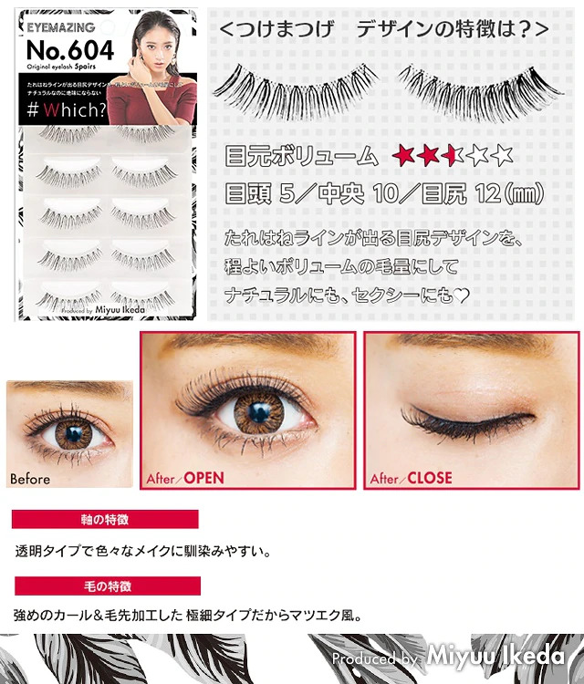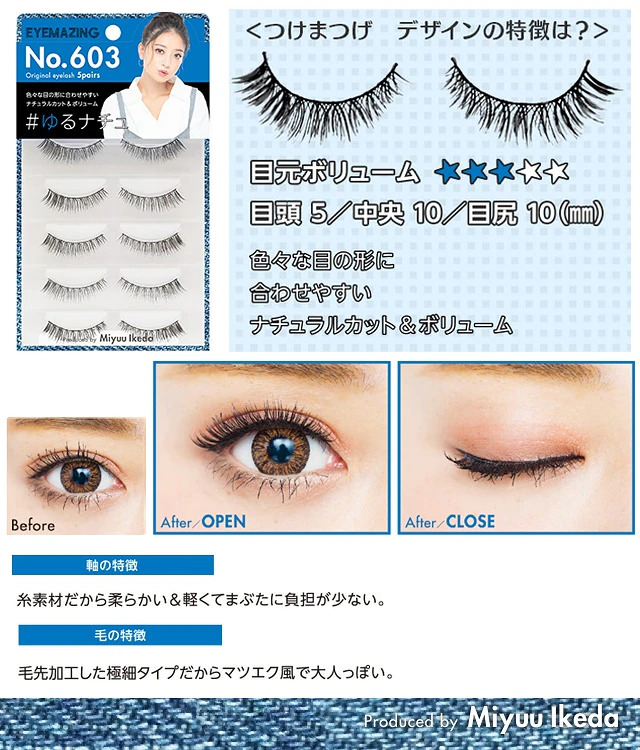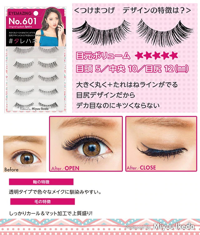 みちょぱがTwitterユーザーにアンケートを取りながら企画を進めた商品で、 「薄くても盛れるデザインはなかなかない」というユーザーの声を取り入れています。 人気の「No.601 #タレハネ」のデザインはそのままに、毛量を半分に押さえカールを強くかけることで、 ナチュラルにもセクシーにもどんなメイクにも使いやすいデザインになっています。