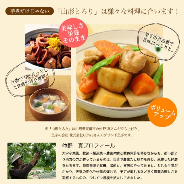形状はころっと丸く、その味は、「山形とろり」の名称そのままのとろっとした粘りと旨味が強く、絹のようになめらかな舌触りで、舌で押しつぶせるほどやわらかい食感が特長です。一口食べれば一般的な里芋との違いは歴然です。この里芋で、山形名物「芋煮」などの煮物を作ると、粘り成分が溶け出して汁がトロりとするほど。皮を薄く剥いて丸ごと煮込めば、旨味と粘り成分が閉じ込められた最高の煮物ができあがります。