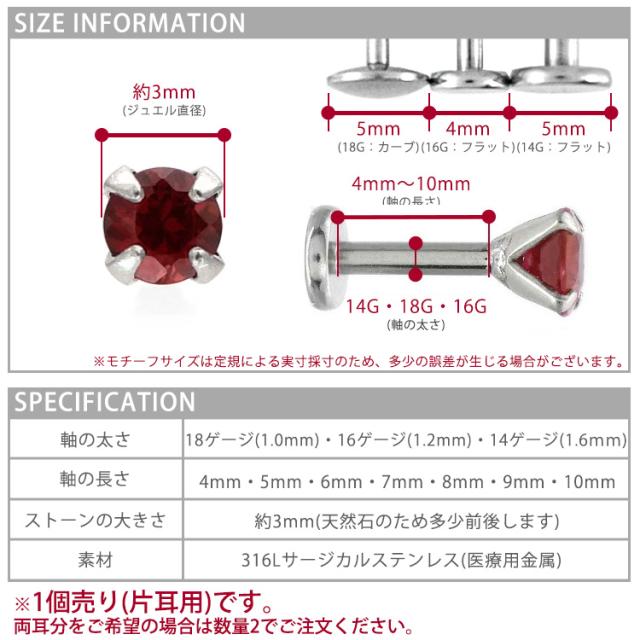 ピアス 18G 16G 14G つけっぱなしにおすすめ 誕生石 天然石 1月 ガーネット 3mm 立爪ジュエル ラブレット ファーストピアス セカンドピアス 軸太1mm ボディピアス 華奢