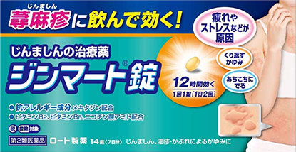 「ジンマート錠」は、抗アレルギー作用と抗ヒスタミン作用を併せもつ有効成分 メキタジンを配合し、蕁麻疹とかゆみを体の中から抑え、あちこちに広がる蕁麻疹を治します。眠くなりにくく、口がかわきにくいのもメキタジンの特長。また、皮フ・粘膜の正常な働きを助けるビタミンB2(リボフラビン)、湿疹・皮フ炎の改善作用などを有するビタミンB6(ピリドキシン塩酸塩)とニコチン酸アミドも配合しました。