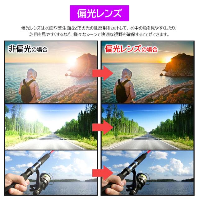 | 商品詳細 【調光偏光スポーツサングラス】ao114c ◇調光レンズ 紫外線に即時反応し、レンズの色が均一に変化します。 紫外線の強さに応じて、レンズの色の濃さが変わります。 ◇偏光レンズ 水面や芝生面などでの光の乱反射をカットして、水中の魚をみやすくしたり、 芝目を見やすくするなど、様々なシーンで快適な視野を確保することができます。 ◇ラバーコーティングフレーム やわらかな肌触りのラバーをフレームにコーティングしました。 使用中のズレを軽減し、優れたフィット感をもたらします。 スポーツシーンはもちろん、ドライブ、フィッシング、レジャー、タウンユースなど、 幅広く活躍するサングラスです。 | |