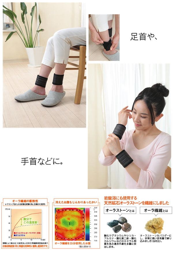 ・手首、足首、首すじ、土踏まず等に巻くだけで指先までポカポカ。