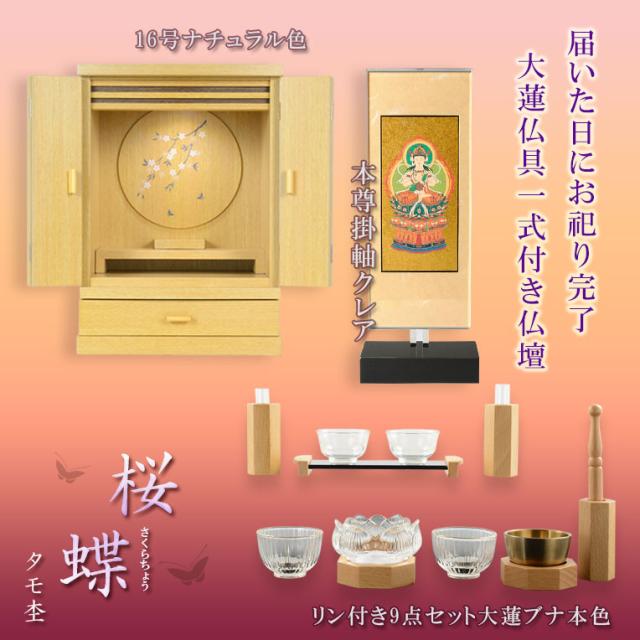 現代調モダン仏壇【天然タモ杢 幻想的で優美な絵柄:桜蝶(さくらちょう)16号ナチュラル色+大蓮仏具一式付き】電池式高輝度ダウンライト付属 送料無料