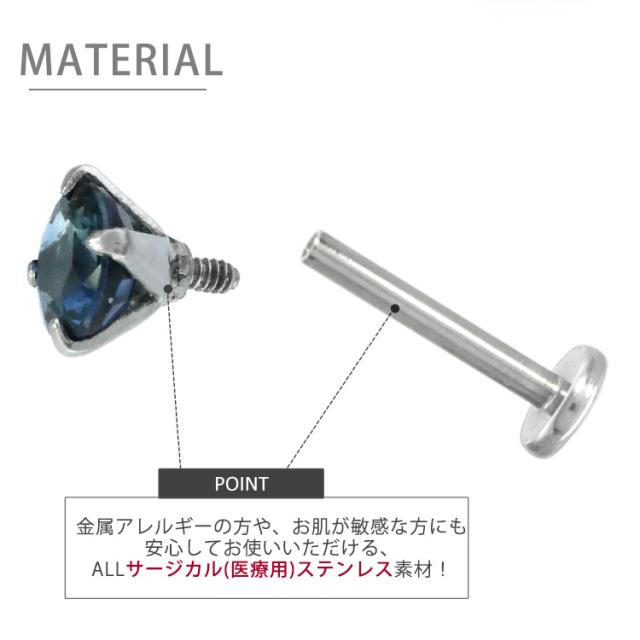 今や不動の人気を誇る、キラキラジュエルヘッドのボディピアスに誕生石が登場しました。ジュエルは4つの爪でしっかりセッティングされているので、どんな時でもどの部位でも安心です。太さは人気の18G、16G、14Gをご用意致しました。しかも、ホールに優しいインターナル(内ネジ)タイプ。ネジ山が直接ホールに触れないため、ファーストピアスにもお勧めです。耳たぶピアスに、軟骨ピアスに、もちろん口ピアスに、究極カスタムで自分だけのボディピアスを楽しめる自慢のアイテム。ピアスの材質には、金属アレルギーにも安心の医療用素材”316Lサージカルステンレス”を採用しています。 時間がたっても変色や変形しにくく、金属の輝きが色あせません。