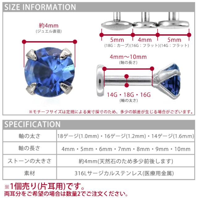 ピアス 18G 16G 14G つけっぱなしにおすすめ 誕生石 天然石 9月サファイア 4mm 立爪ジュエル ラブレット ファーストピアス セカンドピアス 軸太1mm ボディピアス 華奢