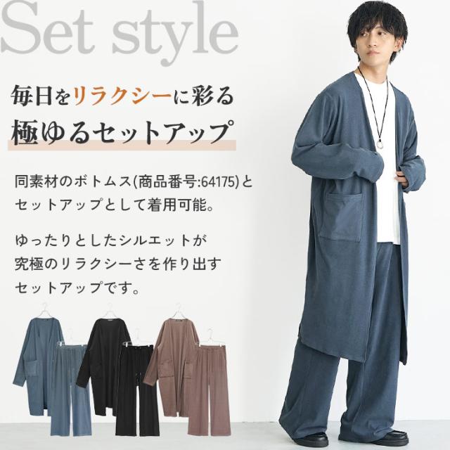 ゆったりとしたサイジングと縦の落ち感が、優雅な生地の揺れ感を作り出すロング丈のカーディガン。インナーを選ばない襟なしデザインで、上品にもカジュアルにも着こなせる一枚。外出時はもちろんのこと、肌寒さを感じるときのルームウェアとしても活躍するアイテムです。同素材のワイドパンツ(商品番号:64175)と合わせることで、セットアップとして着用が可能です。