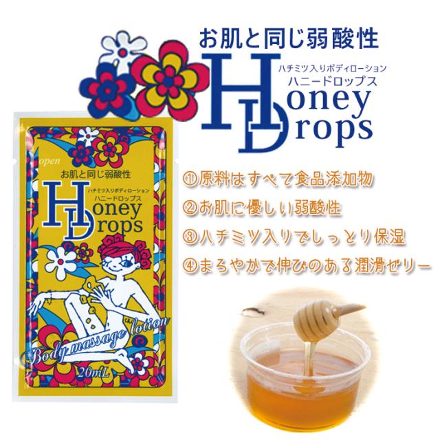 | 商品説明 | ハニードロップスはハチミツ配合のローションです。食品添加物として使用される原料のみを使用しています。(※食品ではありません) 携帯に便利な使い切りタイプ。 |