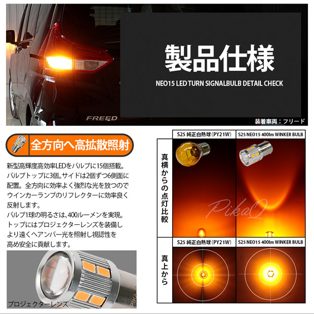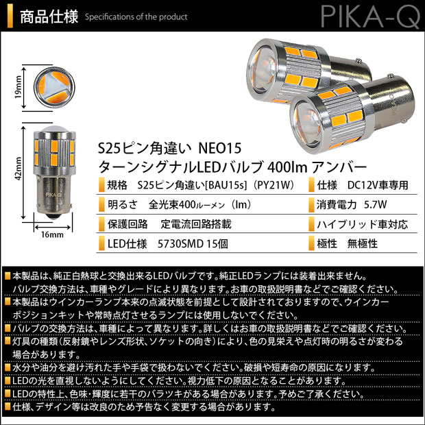 フロントウインカーランプ用LEDバルブ 全光束400ルーメン S25ピン角違い[BAU15s] LED TURN SIGNAL BULB 『NEO15』シングル口金球 LEDカラー:アンバー 1セット2個入り | |||